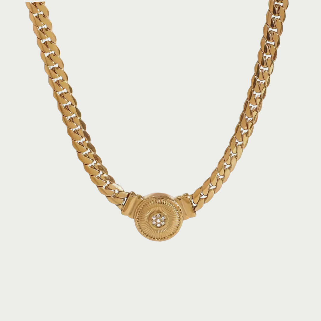 Channel timeless Parisian elegance with the Bebe Necklace, a vintage-inspired piece reminiscent of treasures found in a flea market in Paris. This necklace features a bold 18K gold-plated double chain design, featuring an intricately detailed medallion centrepiece with sparkling cubic zirconia, adding a touch of subtle glamour.