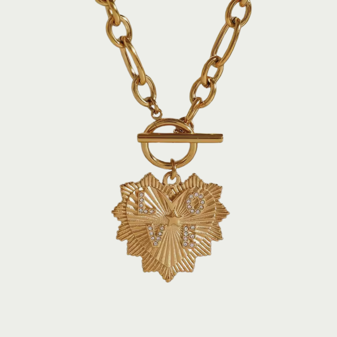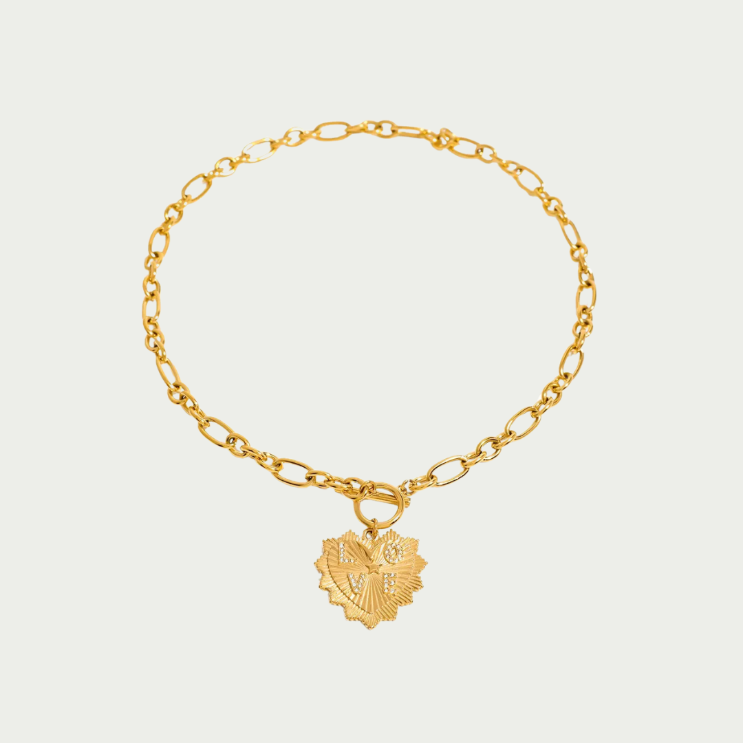 Elevate your everyday look with the Rae necklace, a piece designed for the modern romantic. This necklace features an intricate heart-shaped medallion engraved with the word "LOVE," set on a bold yet refined link chain. Whether layered or worn solo, this piece adds a touch of vintage-inspired charm to any outfit, reminding you to lead with love wherever you go.