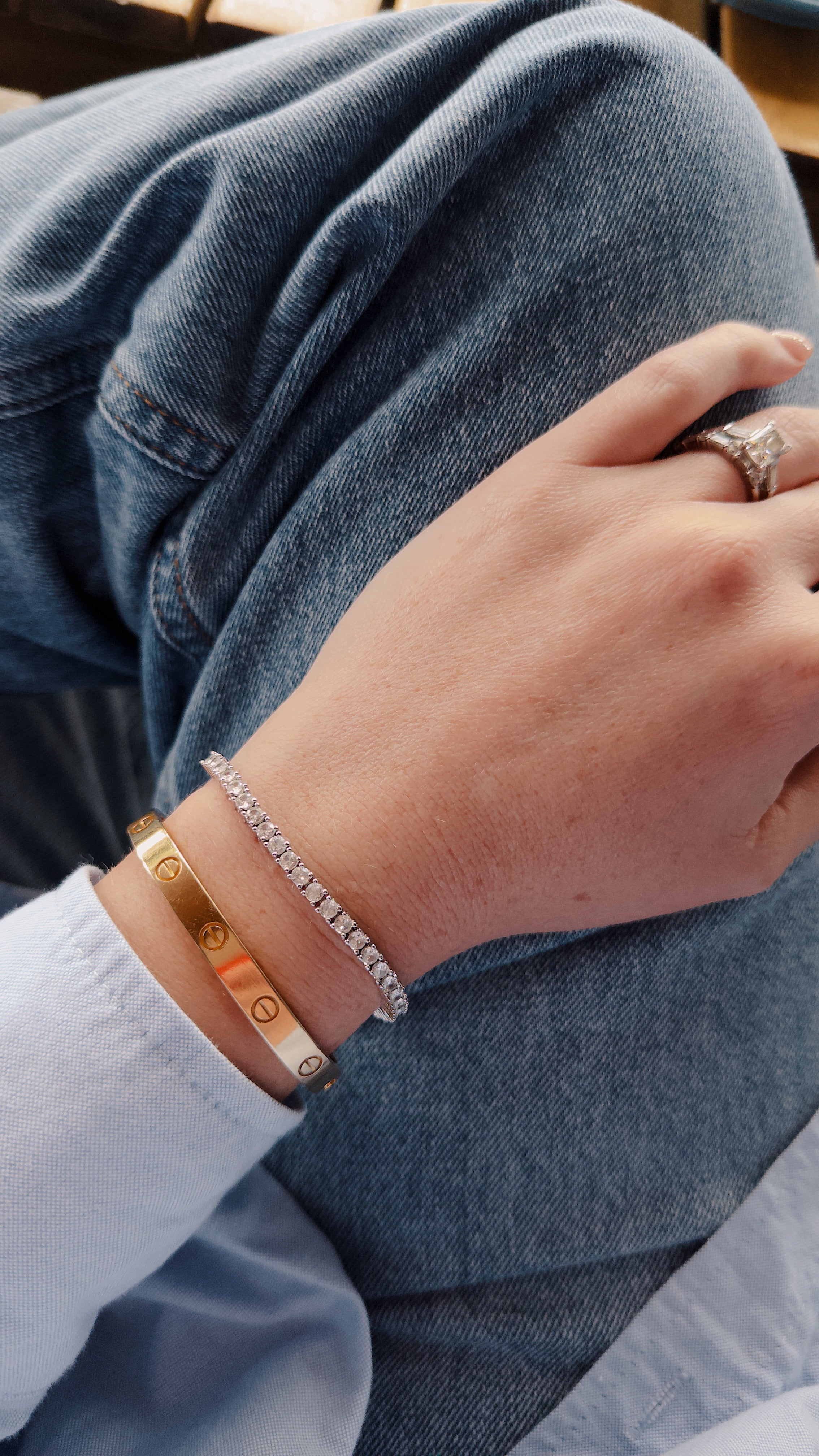 An icon for a reason. The Classic Tennis Bracelet is the epitome of refined simplicity, crafted in brass and dipped in radiant silver plated, then hand-set with brilliant 5A cubic zirconia for maximum sparkle.
