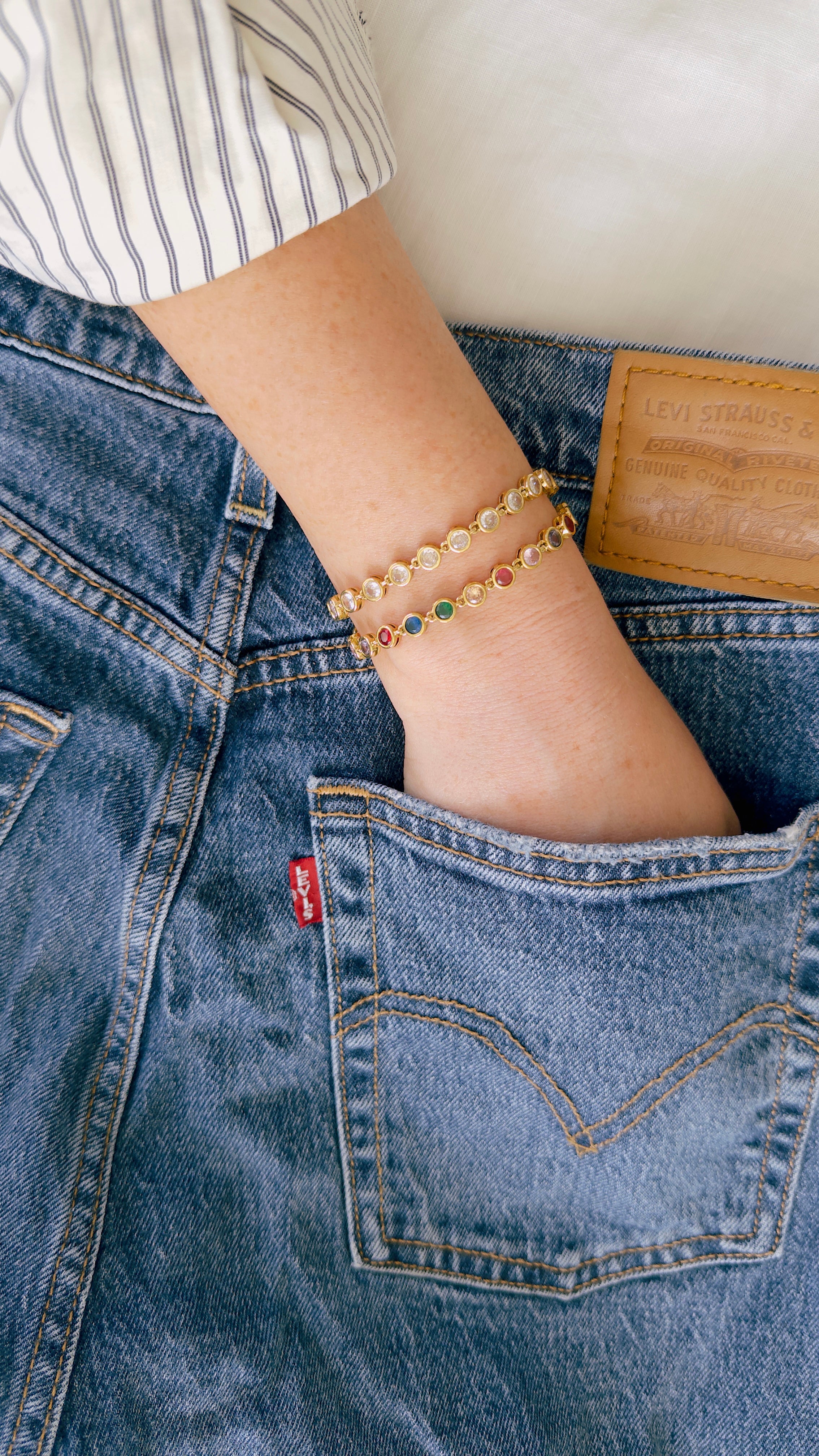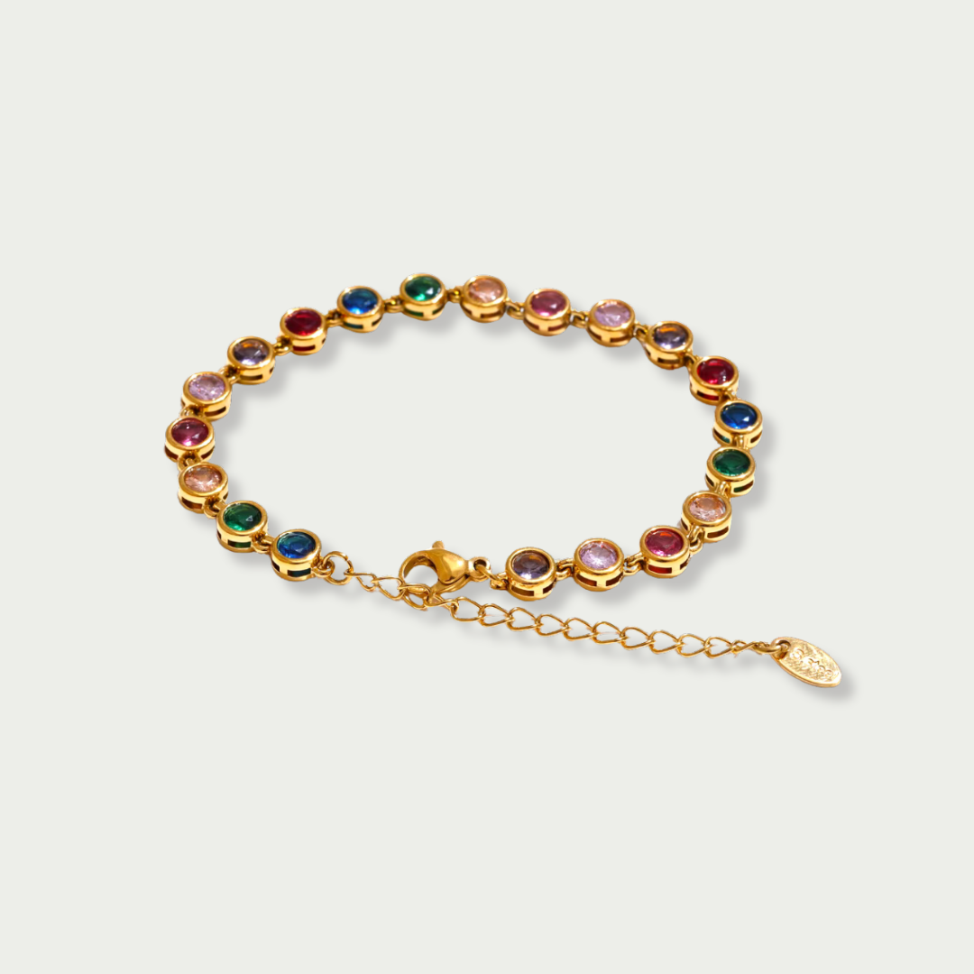 Brighten up your jewellery collection with the Zara bracelet, a vibrant accessory designed to add a playful yet elegant touch to any look. Featuring cubic zirconia stones set in gold-tone bezels, this bracelet is perfect for adding a pop of colour to your outfit. Its adjustable design ensures a comfortable and secure fit for all-day wear.