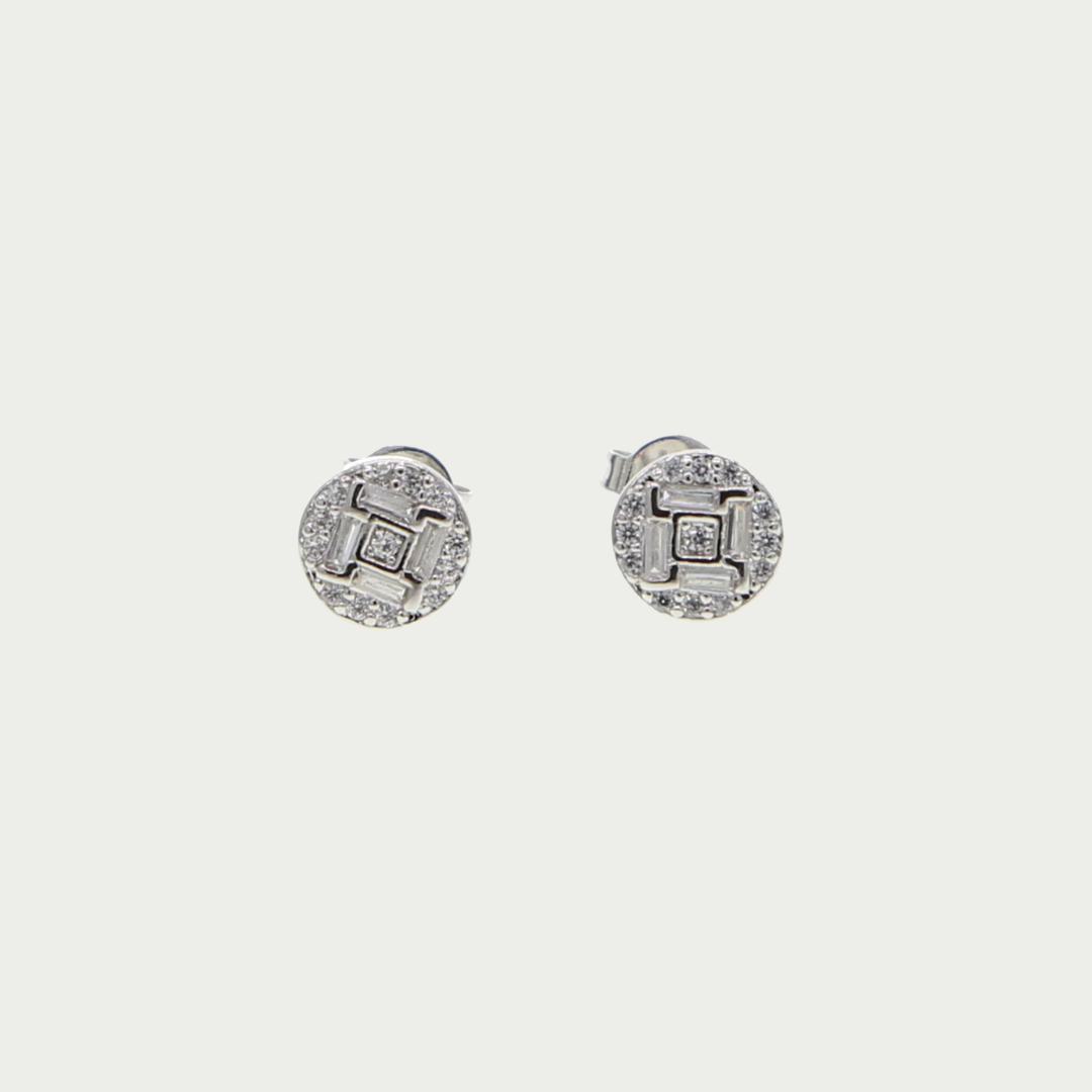 A timeless nod to vintage glamour, the Monet Earrings are an exquisite blend of modern elegance and old-world charm. Crafted with a platinum-plated finish, these round studs feature a striking mosaic of baguette and round-cut stones, delicately arranged to reflect light from every angle. The intricate pattern evokes a sense of artful luxury—perfect for elevating both everyday outfits and evening ensembles.