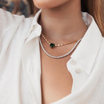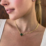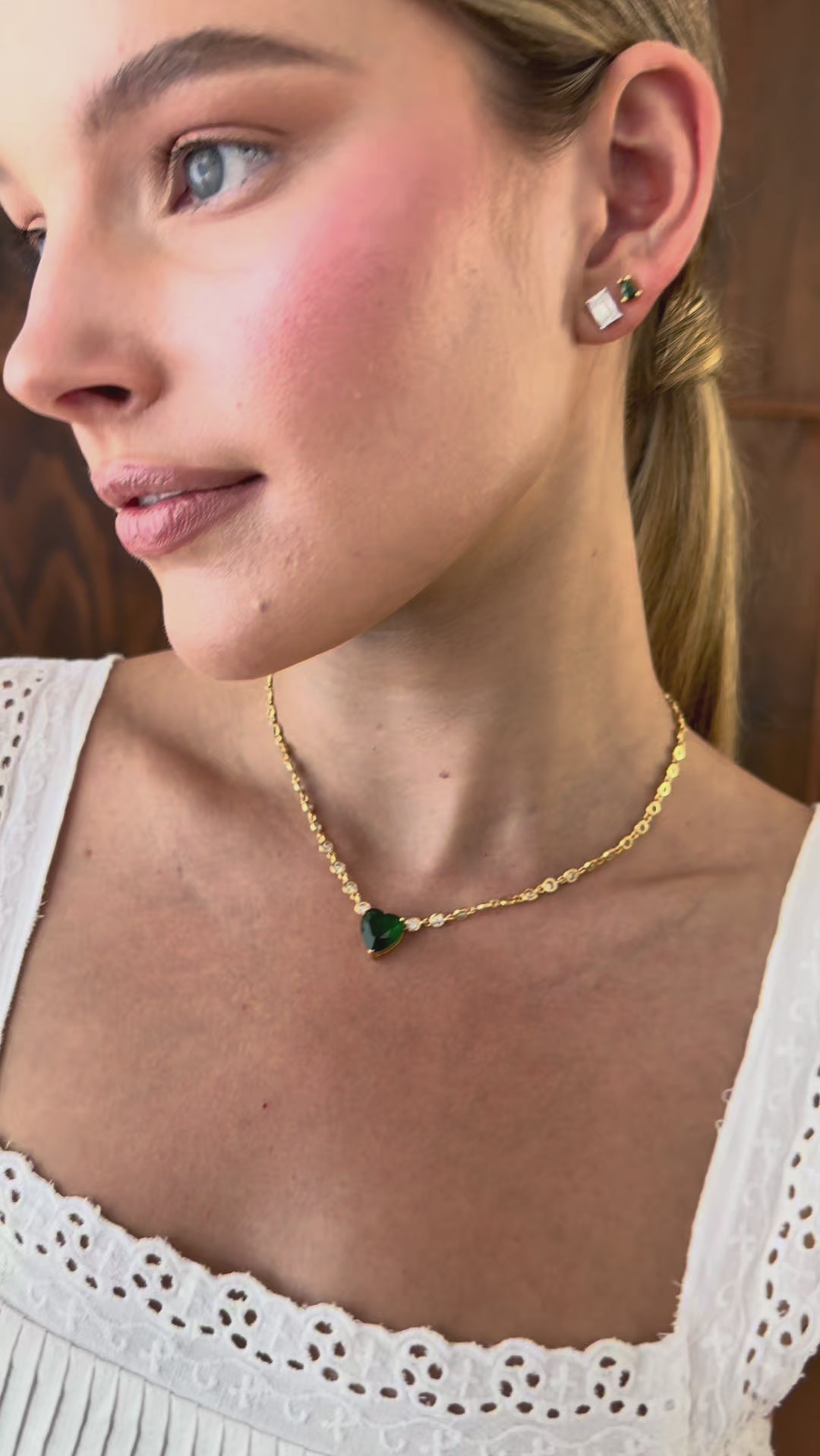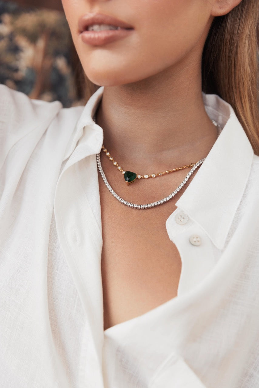 An emerald coloured love heart takes centre stage, symbolising love and vitality, while the delicate chain of diamond like stones adds a refined touch of brilliance. Crafted with a gold finish, this necklace captures both modern charm and classic sophistication, perfect for layering or wearing as a standout piece on its own.