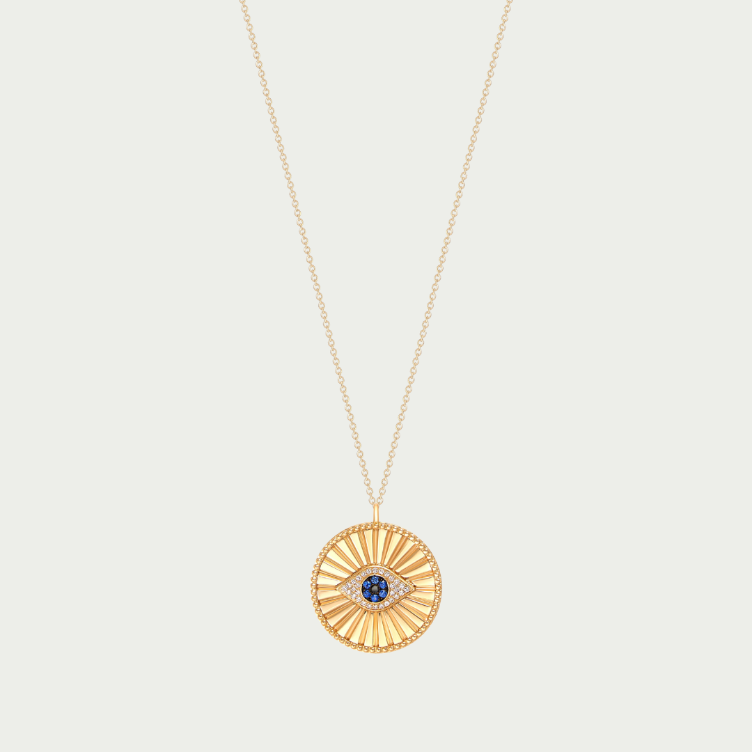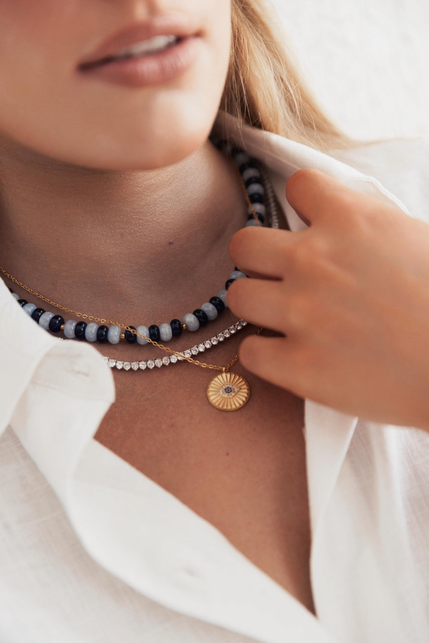 Inspired by the elegance of the Riviera, The Monaco Necklace captures timeless sophistication with a modern edge. Made from gold-plated sterling silver, the pendant features a sunburst design framing a sapphire-blue evil eye, symbolising clarity, strength, and protection.