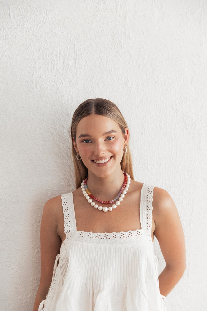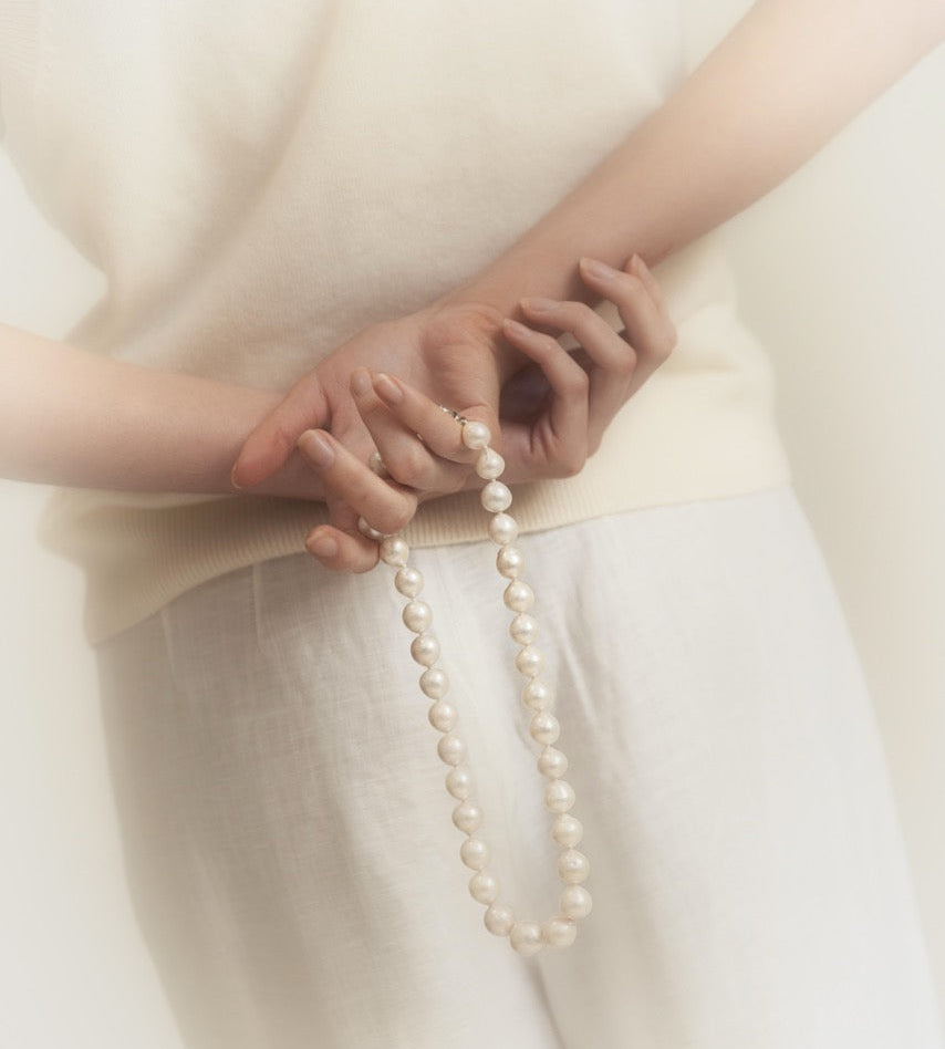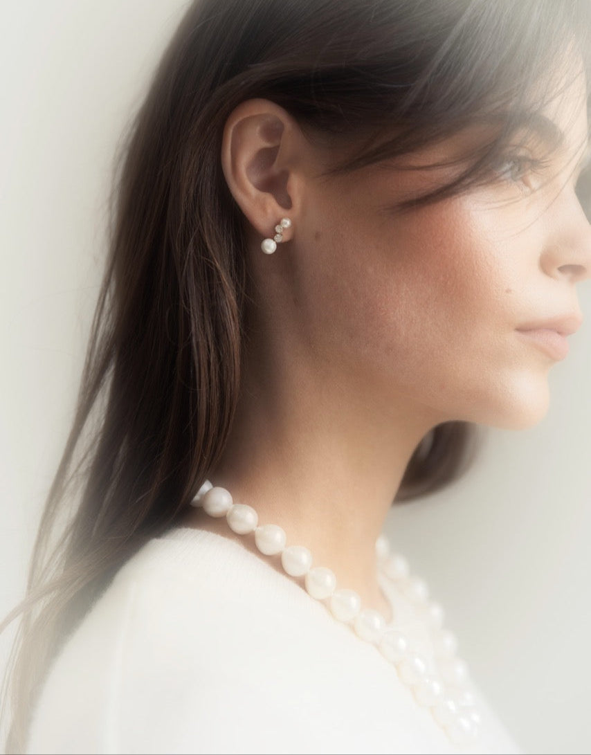 The Angela necklace is your forever piece—a modern heirloom reimagined. Featuring a string of radiant freshwater pearls, each uniquely shaped and hand-selected for its natural lustre, this classic strand exudes understated luxury. Finished with a timeless sterling silver clasp, it’s designed to sit elegantly at the collarbone, making it perfect for both everyday wear and special moments.