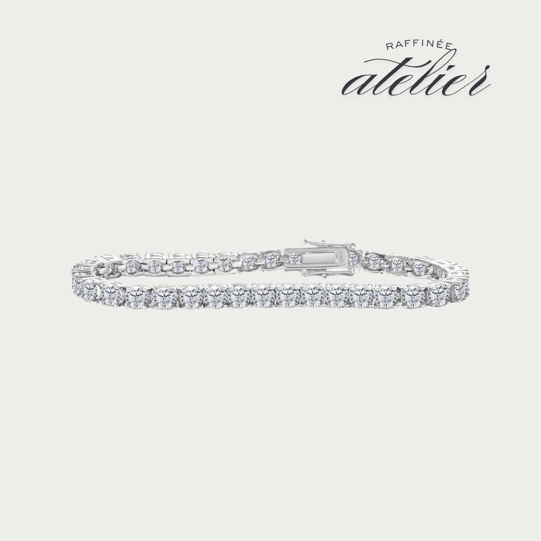 The Odette tennis bracelet is a continuous arc of round brilliant moissanite — 3mm stones in polished sterling silver that move beautifully with the wrist. Few pieces in jewellery are as universally wearable — equally at home with a white linen shirt on a Sunday as they are with an evening dress.