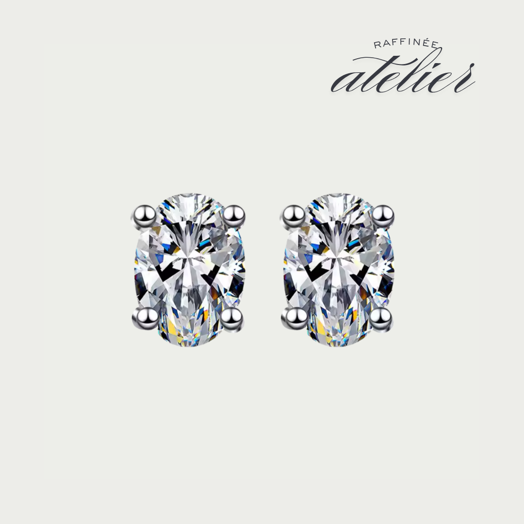 Crafted from 925 sterling silver and featuring brilliant oval-cut lab grown moissanite stone, available in both 1 carat and 2 carat, they offer all the sparkle of diamonds with a modern edge.