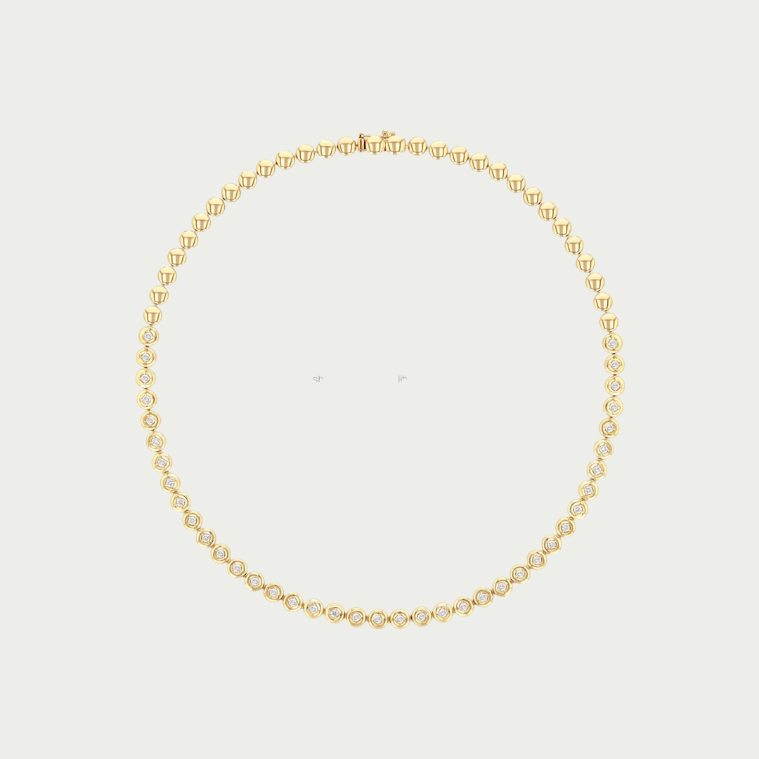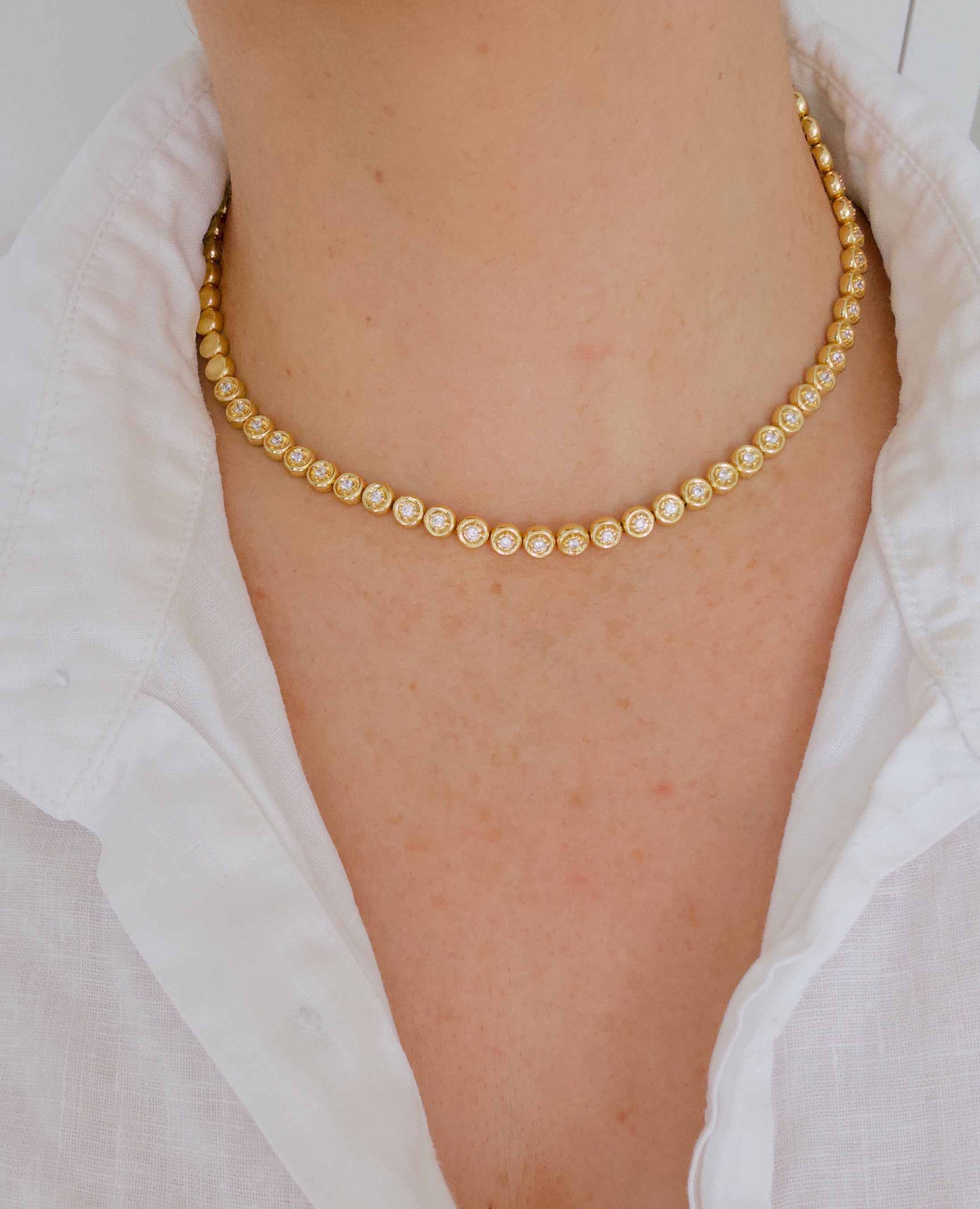 A modern twist on a timeless classic. The Pebble tennis necklace in gold features half rounded bezel set 5A cubic zirconia and half high polish gold pebble like chain. The unique design offers a seamless blend of sophistication and edge, making it the perfect statement piece to elevate any outfit. Whether worn alone for understated elegance or layered for added impact, this necklace is a must-have addition to any jewellery collection.